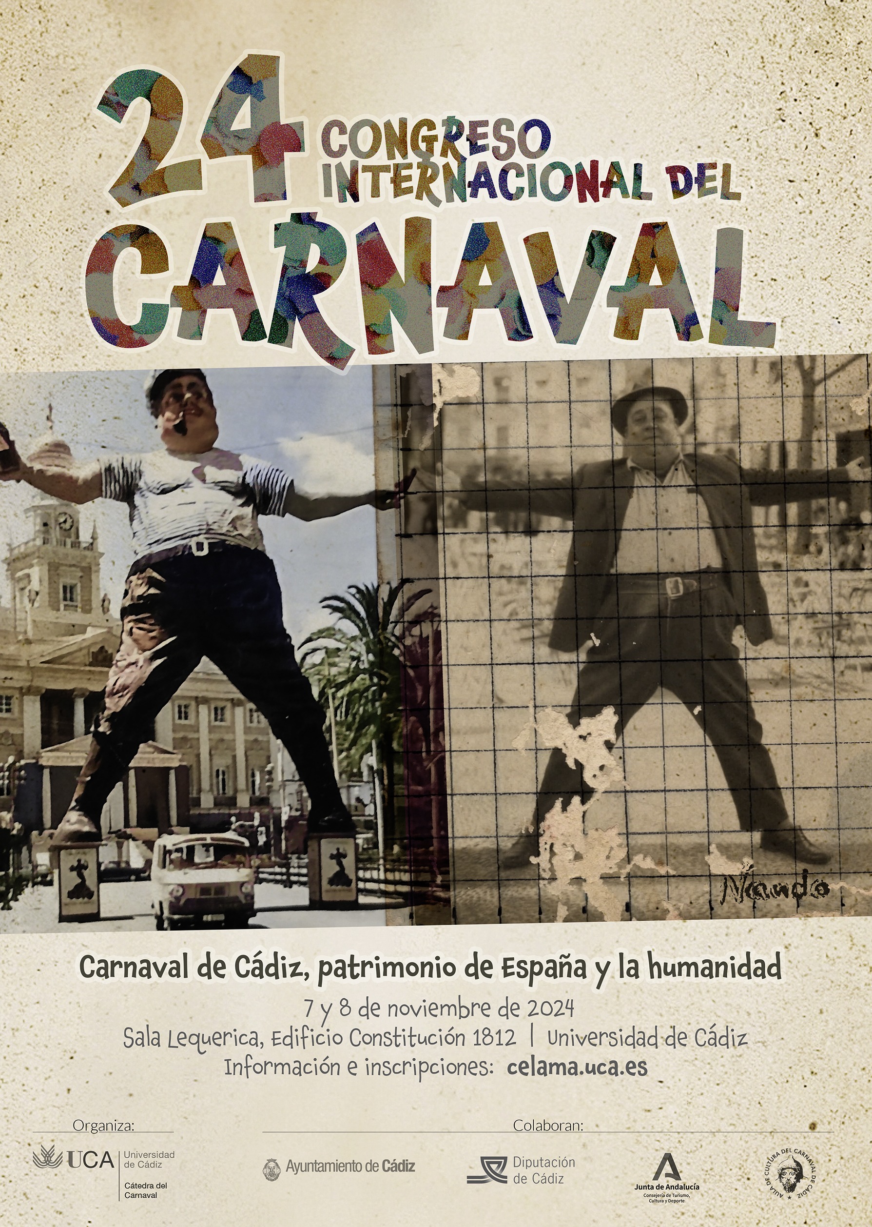 The Chair of Carnival of the University of Cadiz and the City Council of Cadiz, with the collaboration of the Aula de Cultura del Carnaval de Cádiz, Diputación de Cádiz and the Delegation of Tourism, Culture and Sports of the Junta de Andalucía, convene the twenty-fourth International Carnival Congress, which will bring together researchers and scholars on carnival manifestations, to exchange knowledge on the historical, anthropological, ethnic, literary, musical, artistic characteristics ....Carnival as a cultural, historical, ethnographic and artistic heritage.
